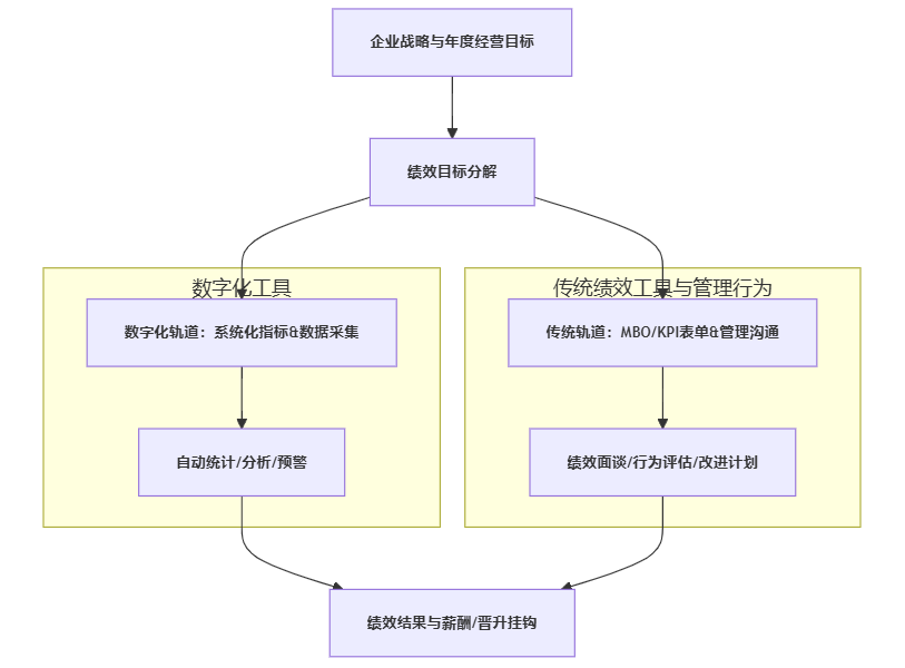 同时,可以用一个简单的架构图,帮助管理者理解“传统+数字化绩效双轨制”的逻辑分工: