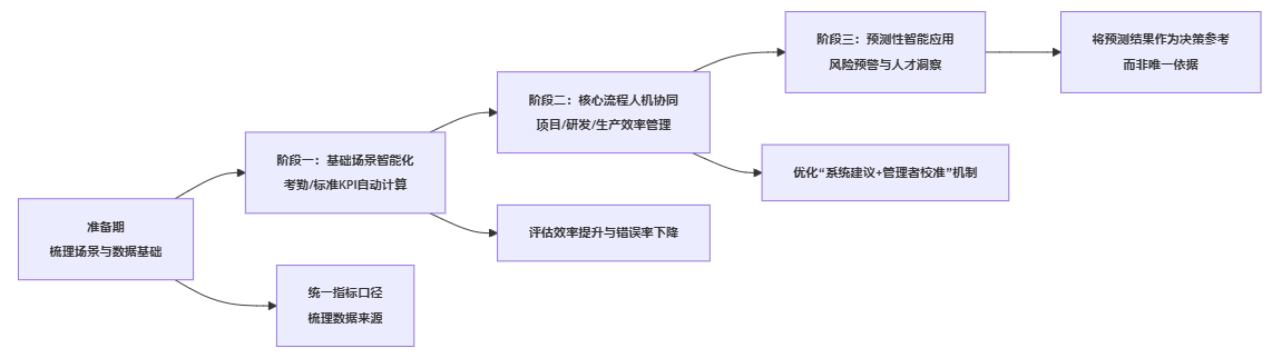 即使3C评估结果显示“很适合引入绩效智能化工具”,也不建议一步到位,而是更稳妥的三阶段走法。
