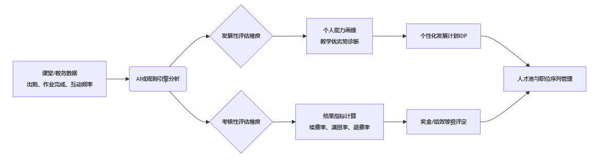 | 一线教师 | 70% | 30% | 课堂质量、教研参与度、学员进步轨迹、学习习惯培养 |