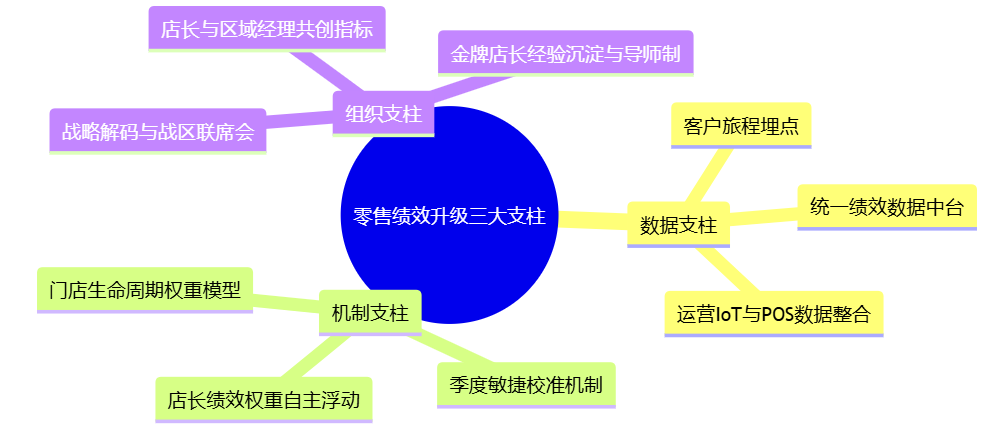 用一张简单的思维导图,概括零售绩效体系升级所依托的三大支柱: