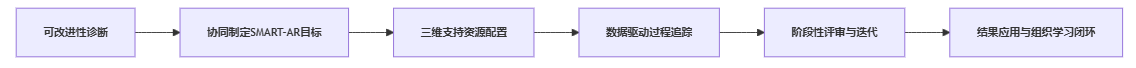 可改进性诊断 → 协同制定SMART-AR目标 → 三维支持资源配置 → 数据驱动过程追踪 → 阶段评审与方案迭代 → 结果应用与组织学习闭环。 - 把主管能力、员工体验和三道合规防线当作实施成败的关键变量