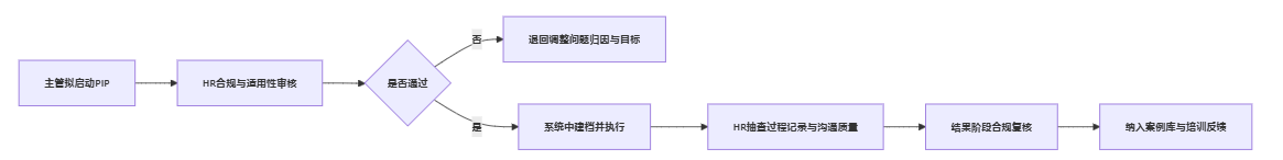 不适合用PIP:严重违纪(如舞弊)、企业战略性裁员、岗位取消等,这些应使用纪律处分或组织调整路径,不能披着PIP的外衣。 - 导向上强调共同解决问题