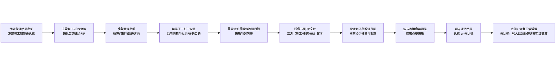 - 评估期内,只要员工达到预设标准,即视为改进成功,继续在原岗位任职。