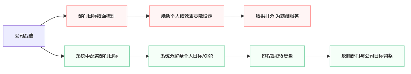 | 目标下达 | 系统批量下发,可按岗位/部门配置模板 | 通过邮件+Excel/纸质表,下发依赖人工 | 批量化&标准化程度差异巨大 |