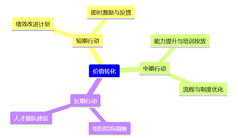 - 围绕短期纠偏、中期能力与流程优化、长期组织与人才布局设计行动组合,并通过复盘会和跟踪指标持续优化;
