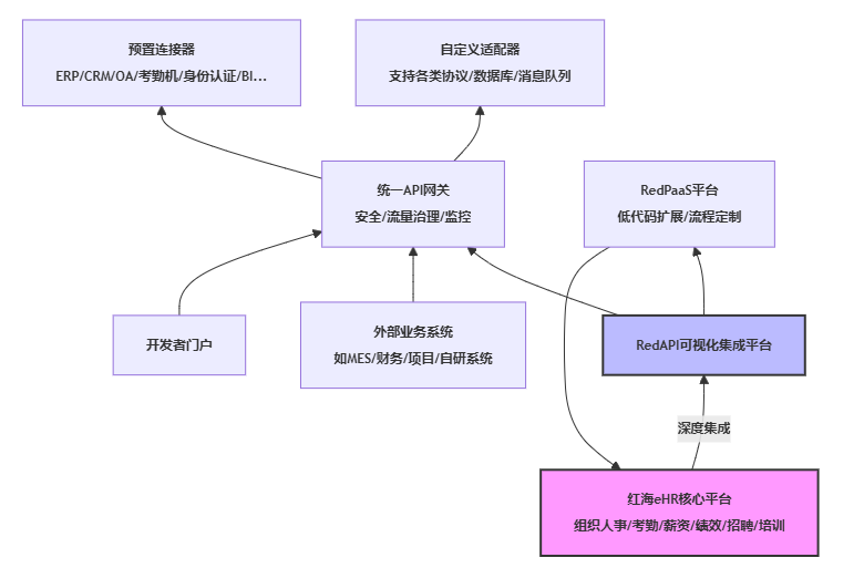 在复杂的系统集成版图中,人力资源因其涉及员工全生命周期数据(从候选人到离职人员)以及与财务、绩效、培训、生产等核心业务的紧密耦合,天然成为企业数据流转的关键枢纽。红海eHR深刻理解这一核心地位,其一体化设计本身就内在地规避了传统“拼凑式”HR系统带来的集成难题。基于自主研发的RedAPI可视化集成平台,红海eHR将深度集成能力作为产品基石,而非事后补救的附加功能。