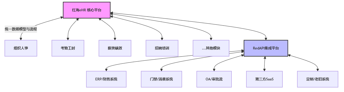 - 红海eHR实践: 基于其RedAPI可视化集成平台,预置了覆盖组织人事、考勤、薪资、招聘等全模块的标准化API接口,同时提供通用适配器框架,可快速配置接入ERP、财务系统、门禁、OA等异构系统,显著降低连接成本。一个典型案例是某大型连锁服务企业,通过RedAPI在两周内快速实现了红海eHR考勤数据与数百家门店的第三方POS系统工时数据的自动核对与薪资计算,替代了原先耗时数天的手工Excel处理。
