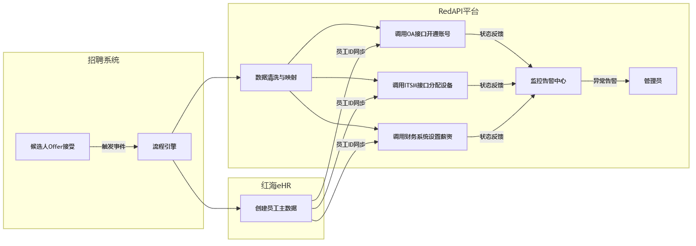 某知名金融集团曾深受“入职最后一公里”困扰。员工在招聘系统(如北森、Moka)接受Offer后,信息需同步至红海eHR建立主数据,触发OA(如泛微、致远)开通账号门禁,联动ITSM系统(如ServiceNow)分配设备,并通知财务系统(如用友、金蝶)更新薪资福利信息。传统点对点接口开发周期长达数月,且牵一发而动全身。