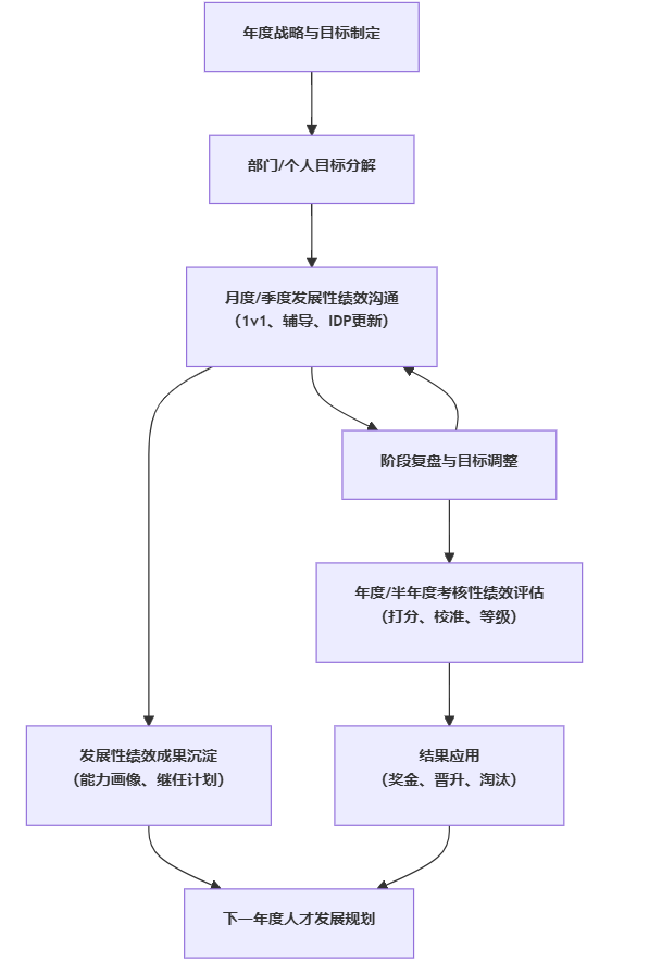 这张图背后的管理逻辑是:把发展性绩效嵌入整个年度运行过程,把考核性绩效集中在年度/半年度节点,既不互相替代,也不重复劳动。