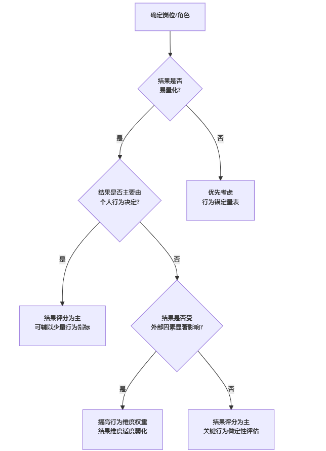 - 对结果难以稳定量化的岗位,优先使用行为锚定量表;