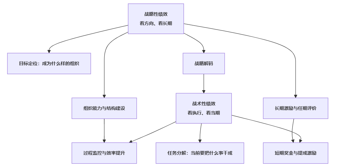 战略性绩效关注“企业往哪走、走到什么位置算成功”,战术性绩效关注“今天具体怎么走、走得是否高效”。
