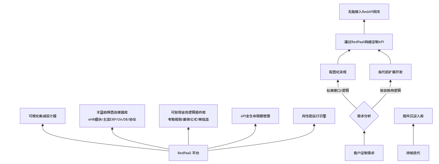 红海eHR深谙大型企业定制化集成的痛点,其核心武器是RedPaaS平台。这并非简单的“写代码”平台,而是融合了低代码/无代码、可视化编排、预制组件库和强大引擎的“集成能力中台”,从根本上改变了定制化API的开发模式: