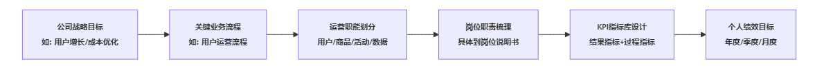 本模块的核心结论是:运营岗位绩效指标如果脱离战略和业务流程,几乎不可能真正发挥导向作用。一个科学的指标体系,应当遵循公司战略目标→关键业务流程→岗位职责→KPI指标库的三级穿透路径,把运营岗位放在业务链条中去理解,而不是从一张空白考核表开始“拍脑袋”。