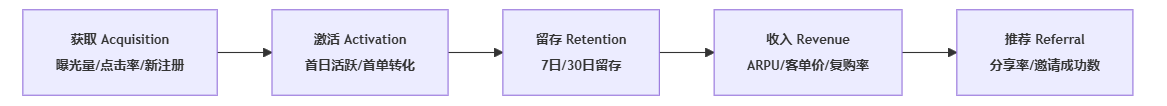 很多企业的用户运营,只考新增用户数或日活,结果是拉新成本越来越高,真正留下来的用户却不多。我们更推荐使用AARRR用户全生命周期模型来设计指标,即:获取(Acquisition)、激活(Activation)、留存(Retention)、收入(Revenue)、推荐(Referral)。