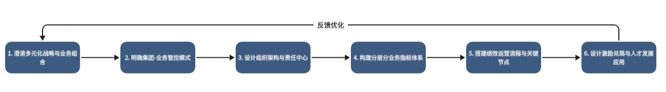 本模块的核心主张是:多元化业务企业的绩效体系建设,可以抽象为“6步一条线”:战略澄清 → 管控选择 → 组织与责任中心 → 分层指标体系 → 绩效运营机制 → 激励与发展应用。
