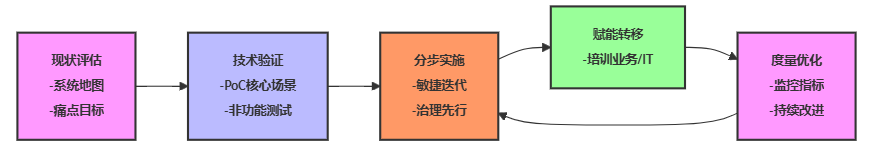 - 配置与治理: 充分利用平台的可视化配置能力,减少硬编码。同时,在实施初期就建立清晰的集成规范、数据标准、API设计规范、权限管控策略和监控告警机制,为后续大规模应用打下坚实的治理基础。设立专门的集成治理小组(可由IT和关键业务代表组成)负责规范的维护和决策。