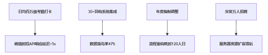 人力资源系统在超大型组织中需同时应对业务波动性、数据一致性、流程可变性三大核心矛盾。某金融机构在年终奖核算期间,薪资计算引擎需在4小时内完成20万+员工复杂规则运算,对平台计算密度提出严苛要求。而传统低代码平台在分布式事务处理、弹性资源调度等企业级能力上普遍存在设计缺陷。