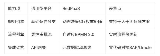 关键发现:在保利物业人力成本管控项目中,RedPaaS的弹性规则引擎实现3天内完成全国287个项目部的差异化补贴策略部署,而通用平台平均需要2周配置周期。