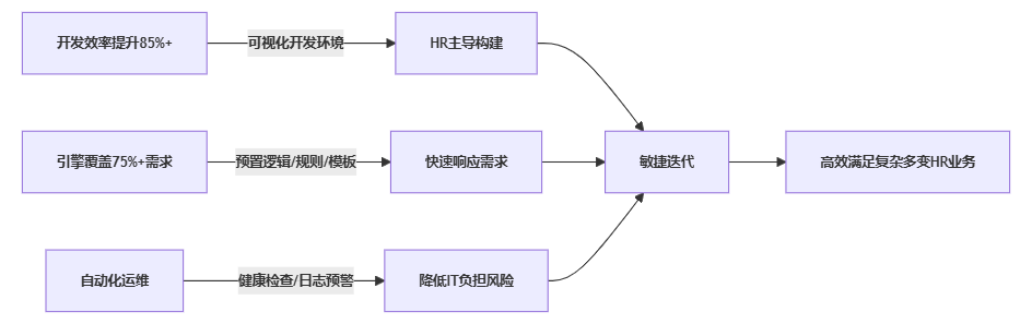 - 开发效能: 全可视化开发环境是核心优势。通过拖拽配置和复用预置资产,开发效率较传统定制开发提升85%以上。显著降低了对专业IT编码技能的依赖,赋能HR和业务人员深度参与甚至主导应用构建,实现真正的敏捷响应。
