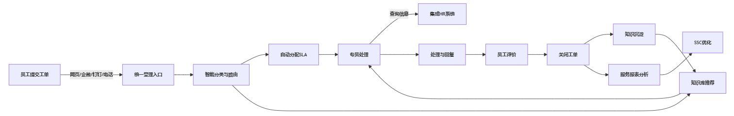 - 流程引擎驱动标准化服务: 设计标准化的SSC工单处理流程(受理-分类-分配-处理-回复-关闭-评价)。利用流程引擎实现智能路由(按问题类型、紧急程度、SLA要求自动分派给合适的专员或处理组)。支持工单升级、转派、催办、SLA超时预警。