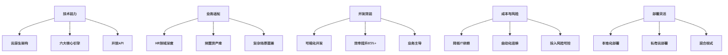 - 领域适配性验证: 这是首要标准。 平台是否真正深耕人力资源领域?考察其预置的业务模型、数据对象、流程模板、规则库是否覆盖且深度匹配HR核心模块(组织、人事、考勤、薪资、招聘、绩效等)。要求供应商演示如何快速构建你关心的复杂场景(如前文所述的职称评审、成本预算、SSC工单),而非仅展示通用功能。