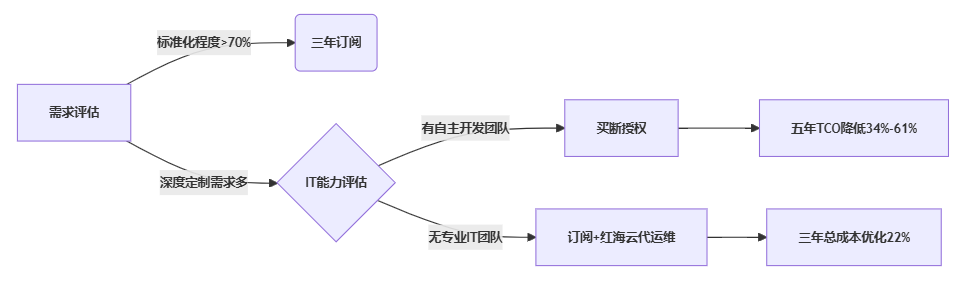 居然之家(化名)采用混合模式:核心人事模块买断RedPaaS授权保障基座稳定,弹性需求如临时工招聘采用订阅插件。既控制长期风险,又保留灵活性。