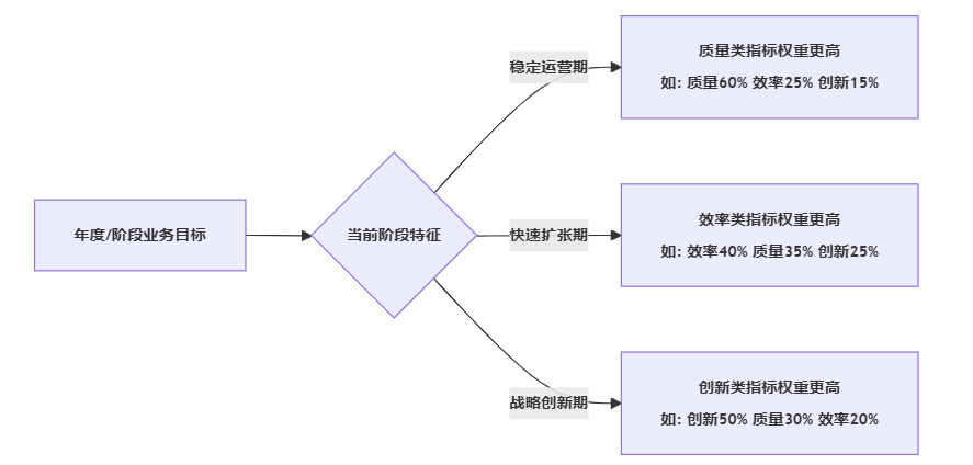 实际操作中,可以先定义三大类指标(质量、效率、创新),再根据年度阶段特征微调各自权重,避免一套绩效表多年不变,失去引导作用。