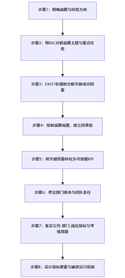 - 步骤7:分解到具体指标与考核周期,并与岗位说明书、流程接口打通。