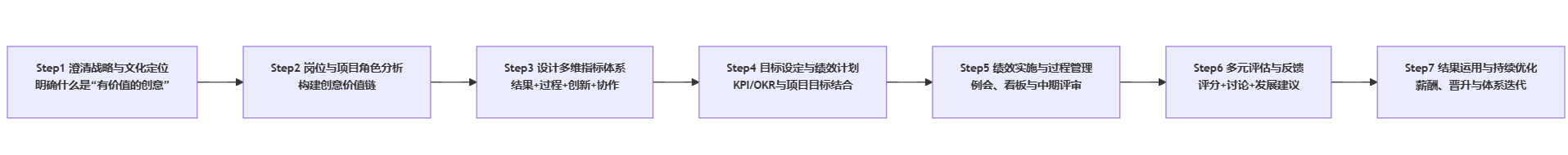 构建文化创意企业绩效体系不是一次性“设计一个表格”,而是一套连贯的管理工程。可以概括为7个连续步骤:从战略与文化澄清开始,到绩效结果的运用与体系迭代结束,环环相扣。忽略任何一个关键节点,绩效体系都有可能变形。