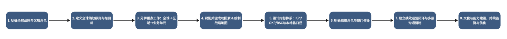 下面这8步,是在经典“战略绩效管理八步法”的基础上,加入跨国经营视角后的系统化路径。为帮助整体理解,先用一张流程图呈现全貌。
