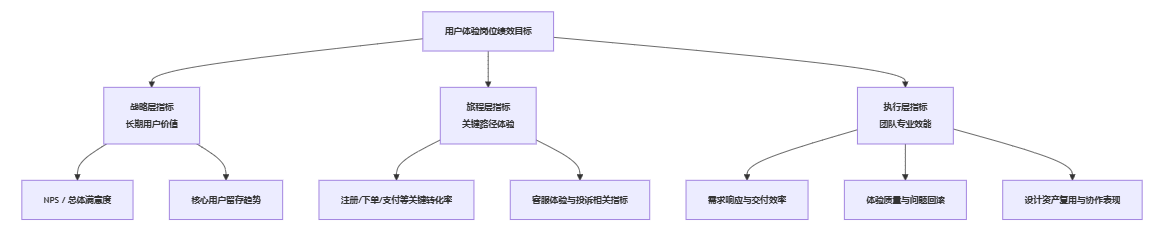 在实践中,如果所有指标都堆在一个层级,会带来两个问题:一是团队搞不清轻重缓急,二是 HR 和业务领导很难从一堆数字中抽象出一个清晰的判断。我们更推荐的做法是,把用户体验岗位绩效指标拆成三层结构: