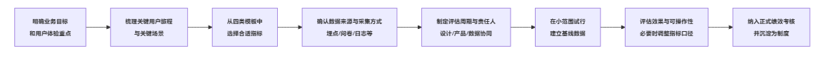 - 先从最关键的 1–2 条用户旅程切入,选取少量高杠杆指标试点;