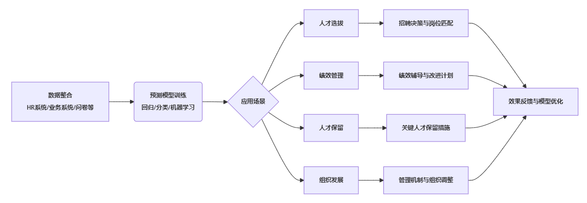 | 中层管理者 | 团队成员绩效预测结果、离职风险分级 | 工作安排、辅导计划、团队结构调整 | 团队绩效提升幅度、关键岗位稳定性 |