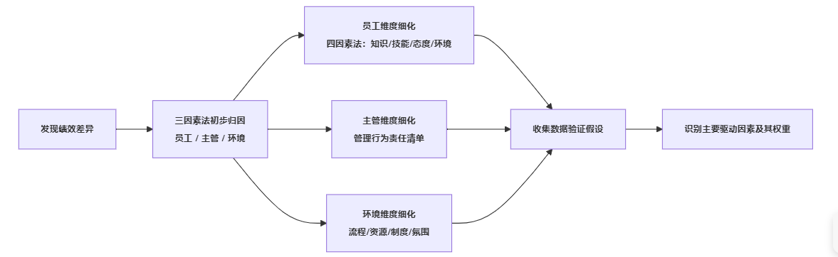 四因素法强调个体层面,容易在实践中演变为“员工背锅”。三因素法从员工、主管、环境三个维度切入,更适合提醒管理层:绩效不好,很可能不是员工一个人的问题。