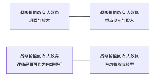 可以构建一个简单的人效-战略象限图,将各部门或业务单元映射其上: