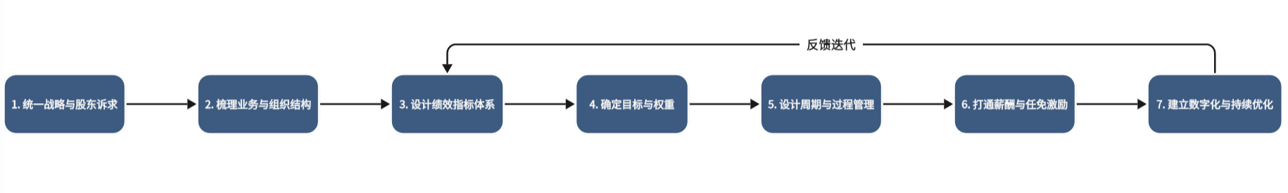 可以看到,第7步又回流影响第3步开始的设计阶段,形成“诊断—优化—再应用”的循环,防止绩效体系一劳永逸、年年照搬。