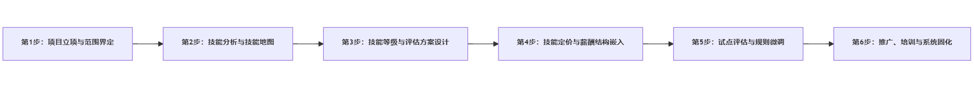 - 通过“立项→技能分析→等级与评估→定价与嵌入→试点→推广与固化”的六步流程,可以相对稳妥地推进技能薪酬改革。