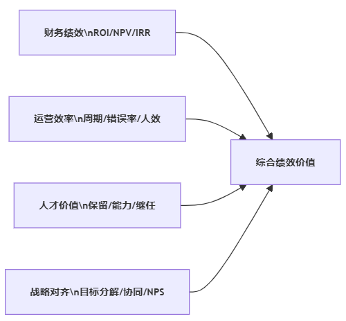 | 执行风险 | 绩效流程流于形式,目标设定和反馈质量低 | 项目纸面ROI高,实际效果很差 | 将执行质量指标(如目标SMART程度)纳入评估 |