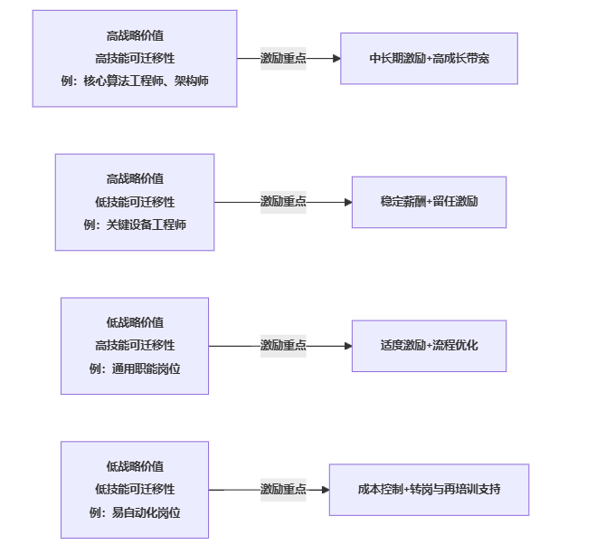 可以用一个简化的岗位激励策略象限,将不同岗位在人机协同背景下的激励重点做个概念性的呈现。