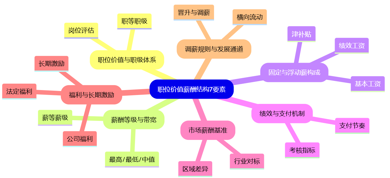偏向描述公司发什么钱、按什么比例发,例如基本工资+绩效+津补贴+奖金+福利。 - 职位价值薪酬结构: