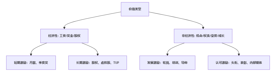 - 长期激励:股权、期权、虚拟股权、TUP(时间单位计划)等