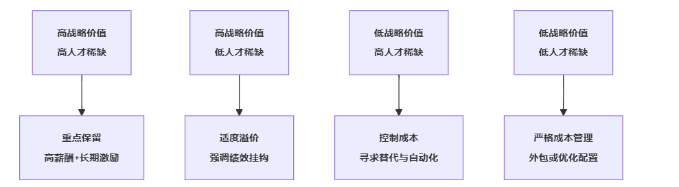 通过前期的数据诊断,将岗位按战略价值和人才稀缺性划分为不同象限,作为薪酬投入优先级的参考: