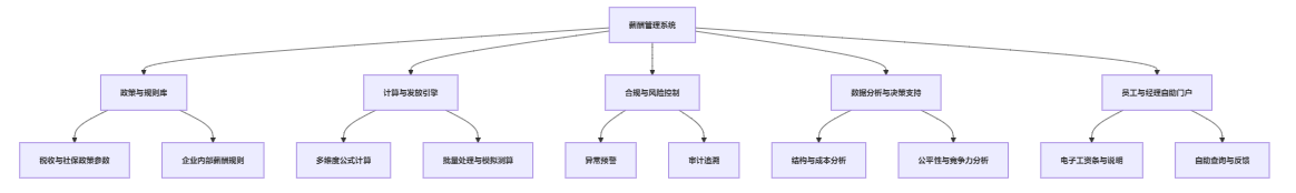 下面用一个框架图概括现代薪酬管理系统在薪酬政策更新执行中的核心支撑功能:
