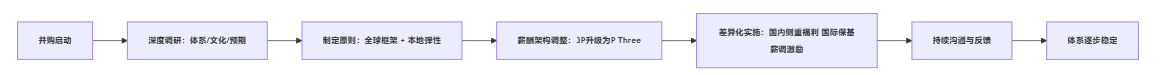 项目初期,团队花了大量时间调研双方原有薪酬体系、绩效管理实践和员工心态,为后续设计打基础。 - 制定原则:全球框架 + 本地弹性