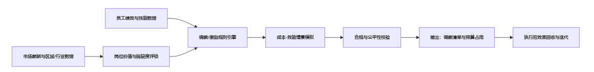 | 阶段二:系统赋能 | 6-18个月 | 决策可模拟、流程可固化 | 成本-效能模拟;调薪规则引擎;权限与审计;与绩效/招聘数据贯通 | 调薪流程在线化;预算模拟模型;合规审计日志 |