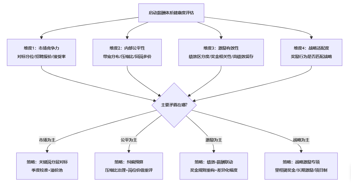 在实践中,许多薪酬争议的难点不是没有方案,而是无法对齐事实:到底是市场竞争力不足,还是内部不公平,还是激励失效,或是战略方向变了但薪酬没跟上。我们建议用四维健康度做体检,并形成可讨论的证据链: