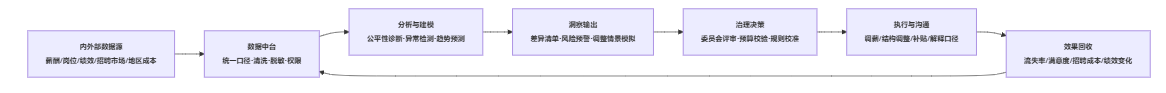 | 数据基础 | 统一口径、岗位映射、脱敏权限、留痕机制 | 数据质量差导致分析失真 | 先治理口径与主数据,再上模型;定期数据稽核 |