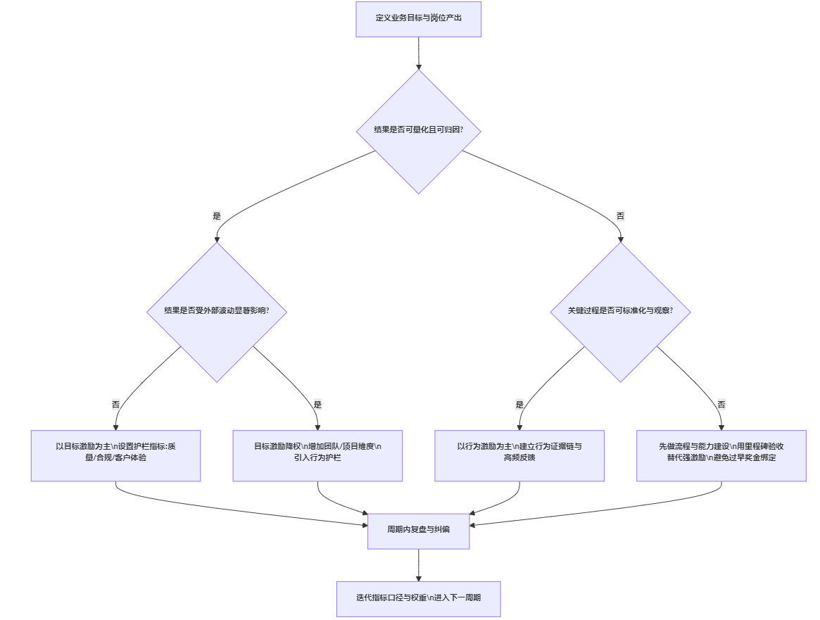这里可以用一个简单的选型逻辑:看两件事——结果可归因程度与过程可标准化程度。当结果可归因高,目标激励的效率更高;当结果可归因低但过程可标准化高,行为激励更能控风险、稳质量。