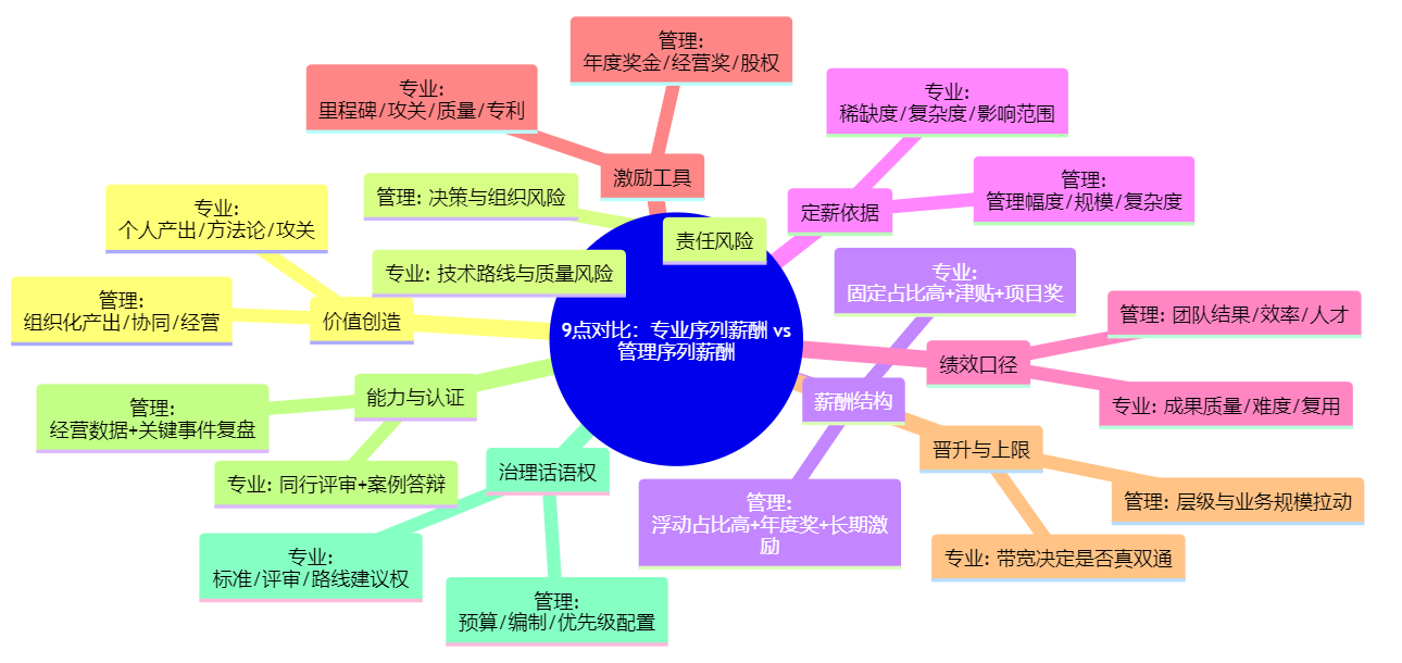 图表1:专业序列薪酬与管理序列薪酬的9点对比框架(思维导图)