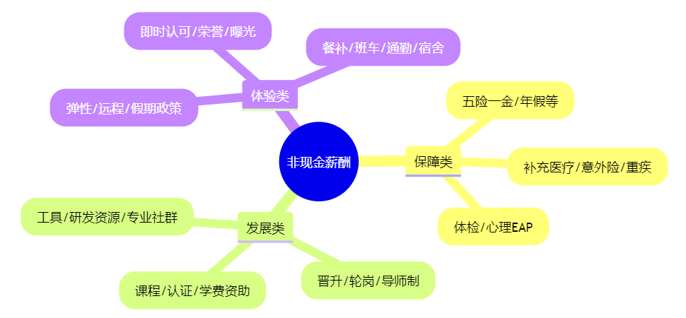 - 广义口径(全面薪酬):除狭义福利外,还包括发展机会、认可表彰、工作设计与授权、组织文化体验、灵活办公等非物质回报。